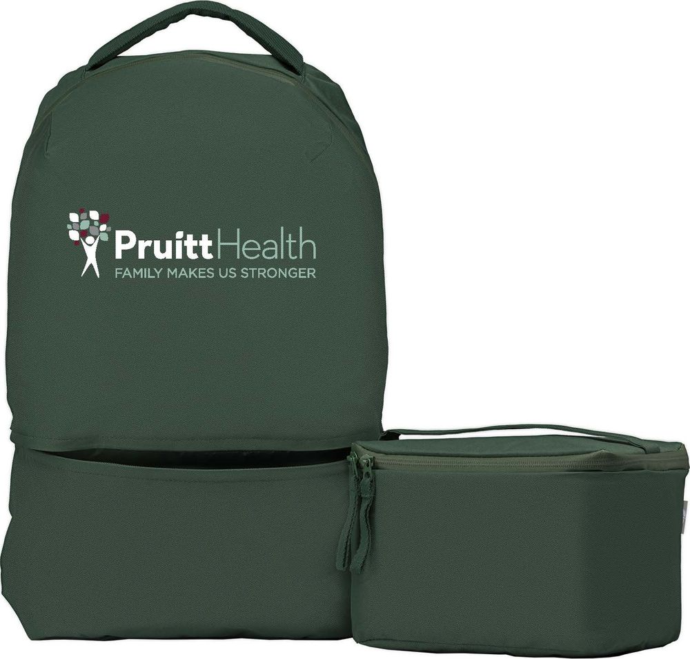 sku: PHS-3532-in-1 Backpack and Lunch Cooler. 100% 300D RPET Polyester with RPEDT210D Lining. Features Two Main Compartments; the Upper Compartment Includes a Padded Sleeve Designed to Secure and Protect a 15" (12"h x 11"w) Laptop. The Cooler Bag, Crafted From 100% RPET 300D Polyester with a PEVA Lining, Provides a Convenient Solution for Keeping Snacks and Beverages Cool On The Go. The Cooler Compatment is Equipped with Sonic-Welded Seams to Ensure Leak Resistance and Enhanced Durability. Waterproof Zippers Further Protect Your Items In All Weather Conditions. The Cooler Has a 14 L Capacity.