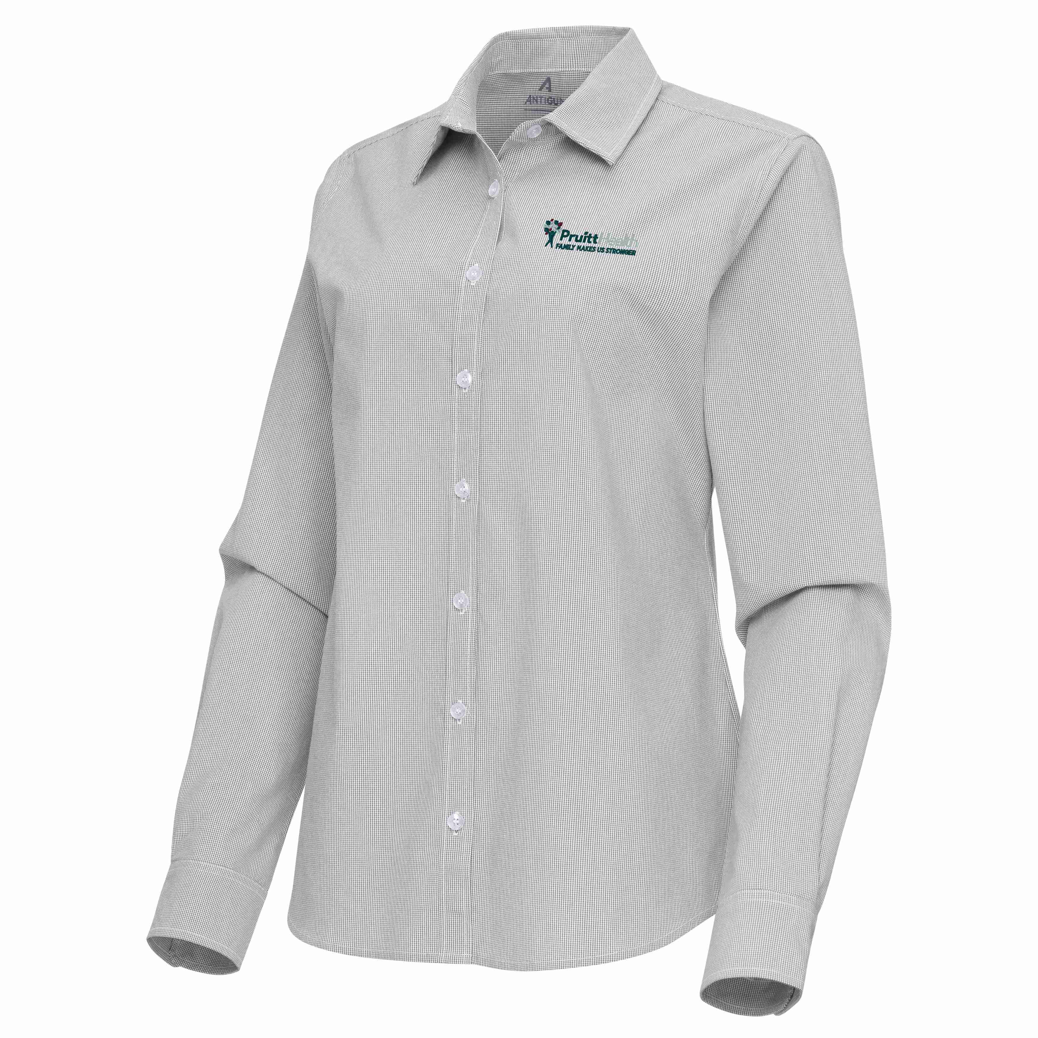 sku: PHS-354-SSPorter Long Sleeve Women's Woven Dress Shirt (Skyscraper/White). Super soft and flexible Micro Check. Full button dress shirt. Collar stand with edgestitch. Rear inverted pleat on center back yoke seam. Antigua "A" flag label on wearers lower left. 70/27/3 cotton/poly/spandex (130 gsm).