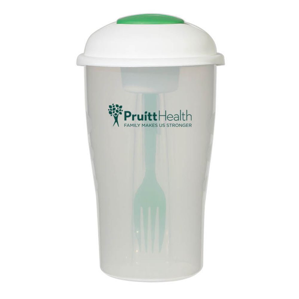 sku: PHS-1283-Piece Salad Shaker Set. Plastic Fork Slides Into Lid for Convenient Storage. Removable Dressing Container Nests in Lid and Holds Up to 4 Tablespoons of Dressing. Holds Up to 4 Cups of Salad. BPA Free. Hand Wash Recommended.
