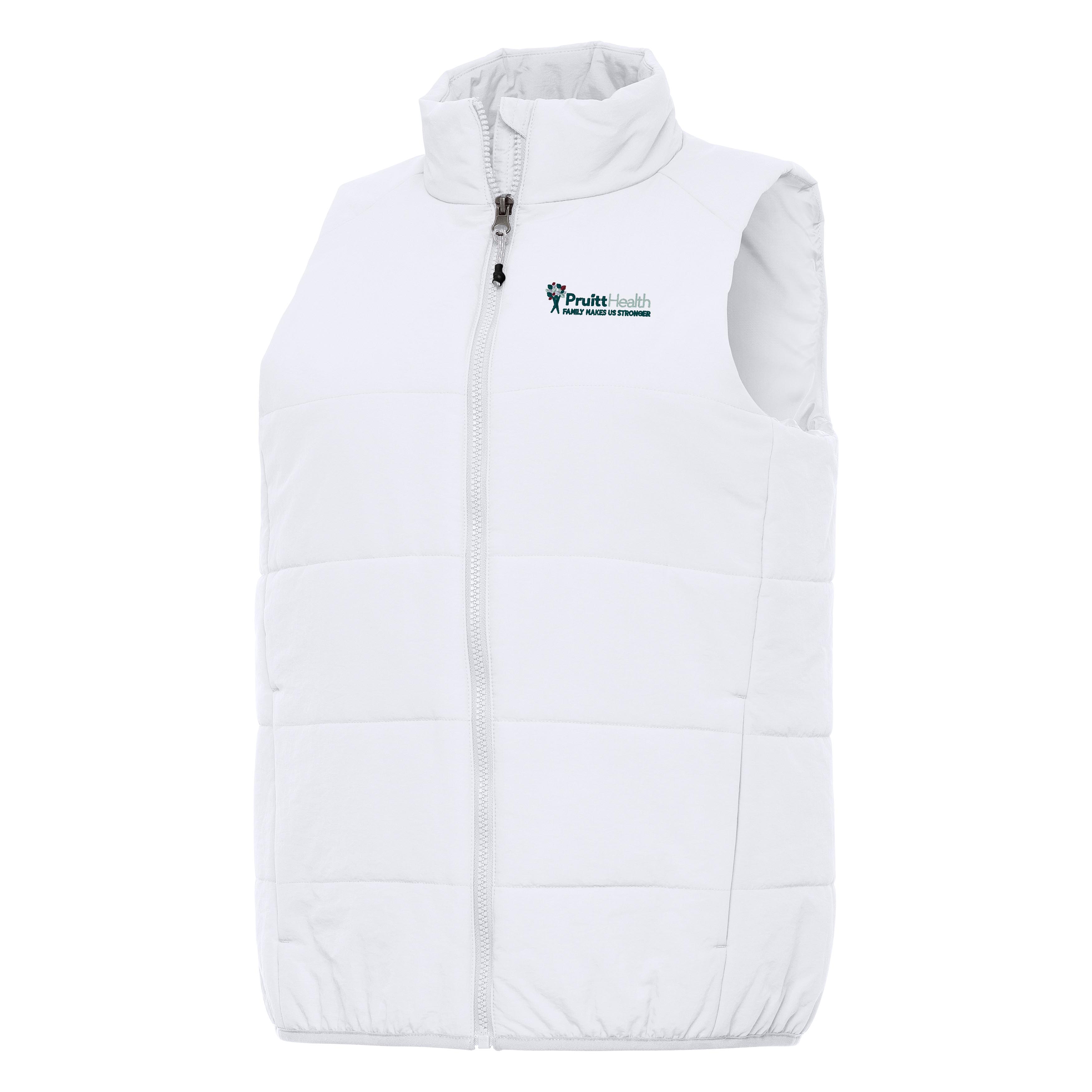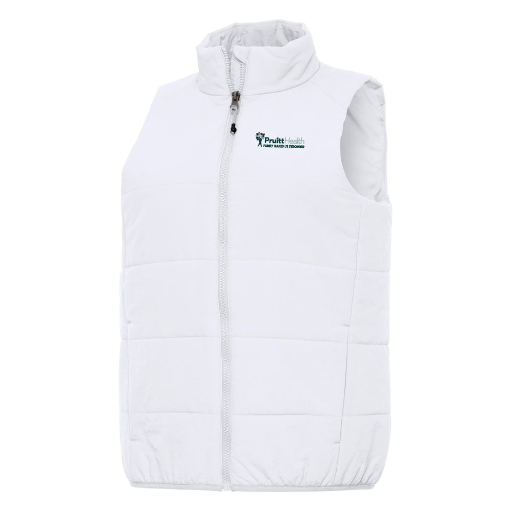 sku: PHS-301-WHTExperience Women's FZ Vest (White). 100% polyester nylon. Matte puffer jacket fabric and quilting with polyester fill. Inner liner, on-seam pockets. Antigua 'A' at right bottom hem.